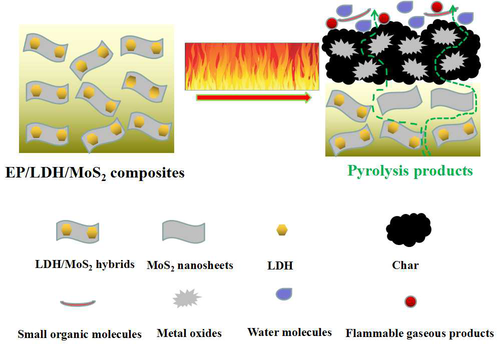 MoS2/LDH杂化材料在环氧树脂复合材料中的阻燃机理示意图