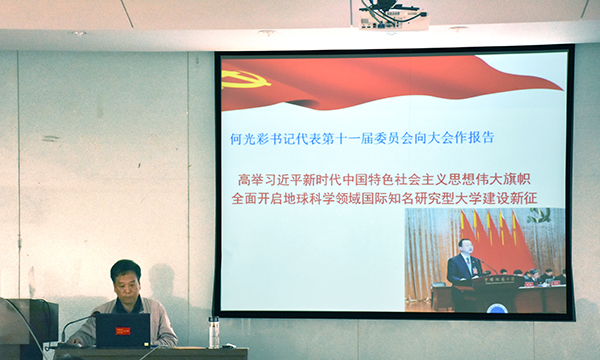 陈飞指出,学校未来发展的宏伟蓝图已经绘就,jdb电子中国官方网站“双一流”建设已经启动,全院教职工都要以习近平新时代中国特色社会主义思想为指导,把全面贯彻落实“十九大”精神和学校第十二次党代会精神放在首要位置,切实把思想和认识统一到学校第十二次党代会精神上来,切实把智慧和力量凝聚到实现第十二次党代会提出的奋斗目标任务上来,在学校新一届党委的坚强领导下,以全面加强党的建设为统领,全面落实立德树人根本任务,进一步解放思想、深化综合改革、追求学术卓越,进一步提升教育教学、科学研究、社会服务水平,努力开创各项工作新局面,为把学校建设成为地球科学领域国际知名研究型大学生作出新的更大的贡献。