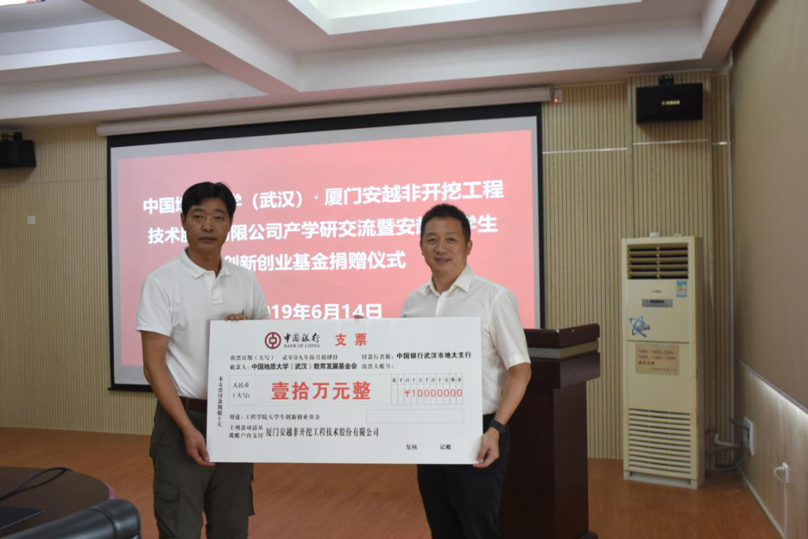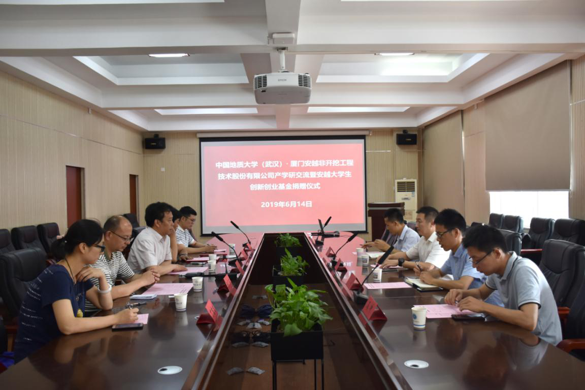 2019年6月14日上午,厦门安越非开挖技术股份有限公司来校作产学研交流,并捐赠10万设立安越大学生创新创业基金,捐赠仪式在315举行。厦门安越非开挖技术股份有限公司董事长廖宝勇一行、武汉中地大非开挖研究院有限公司总经理孔耀祖,校友工作与教育基金管理处副处长吕占峰、丁苗苗,jdb电子中国官方网站党委书记陈飞、党委副书记江广长、副教授曾聪参加会议。江广长主持会议。