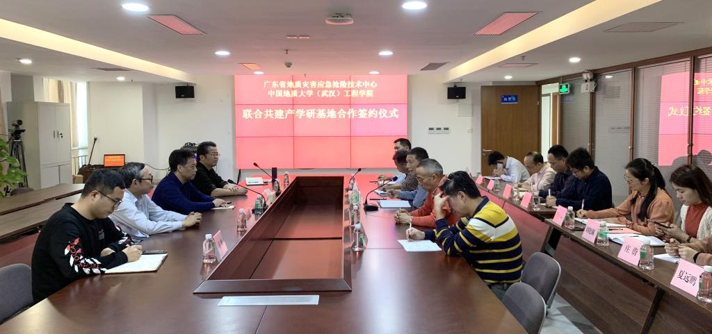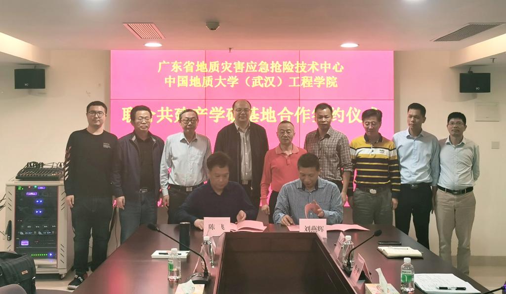 陈飞、刘燕辉签署产学研基地合作协议。根据协议,广东省地质灾害应急抢险技术中心作为jdb电子中国官方网站(武汉)jdb电子中国官方网站的产学研基地,双方将定期就人才的培训、技术的创新、引进与推广、联合攻关、学生实习等方面开展协商研究。