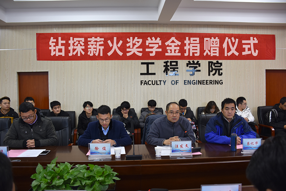 陈飞致辞,他首先向校友汪发文、徐俊及jdb电子中国官方网站蒋国盛、蔡记华、卢春华等几位老师对学院工作和钻探专业的关心与支持表达了谢意。他说,此次捐赠资金来源于校企合作的成果奖励,希望双方今后发挥各自优势加深加强合作,促进科技成果转化;通过设立此次奖学金,更加激励同学们学好专业知识,树立专业自信,为将来投身工程行业,服务国家建设做好准备。