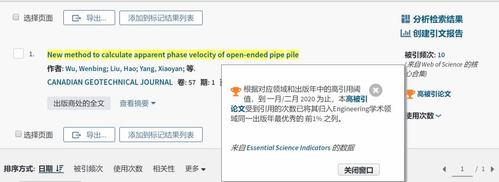(通讯员:吴文兵、黄静)根据2020年5月基本科学指标数据库(Essential Science Indicators,简称ESI)最新数据显示,jdb电子官网勘察与基础工程系吴文兵教授团队2020年在国际土木工程领域顶级期刊《Canadian Geotechnical Journal》 上发表的学术论文“New method to calculate apparent phase velocity of open-ended pipe pile” 入选ESI高被引论文(Highly Cited Paper)。