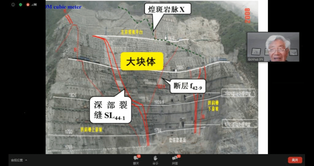jdb电子中国官方网站院长焦玉勇教授作为国际岩石力学与岩石工程学会非连续变形分析专委会主席牵头组织并主持了此次云论坛会议,石根华教授基于数十年的关键块体理论研究工作,介绍了关键块体理论的发展、基本原理及采用赤平投影方法将2D关键块体理论拓展的3D关键块体理论,并且用多个实际工程演示了关键块体理论的坝基、硐室分析应用;赵坚教授以岩石动力学实验及实验设备为出发点,简述了霍普金森杆(SHPB)在高加载率动力学实验中的应用和真三轴SHPB的发展过程及其特性与应用领域;沈鲁明教授以气-液-固一体化微观数值计算方法为核心,介绍了CGMD(coarse-grained molecular dynamic)数值方法,详细阐述了CGMD中多相相互作用关系,并以数值实验对CGMD进行验证,最后介绍了CGMD方法模拟CO2-水-SiO2系统各相介质之间的相互作用。