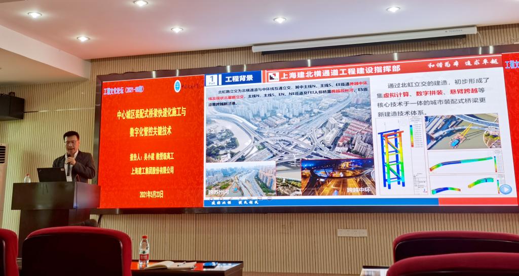 (通讯员 梁荣柱)2021年5月23日下午,应jdb电子中国官方网站院长焦玉勇教授和梁荣柱副研究员的邀请,上海建工集团股份有限公司工程研究总院副院长、jdb电子中国官方网站(武汉)兼职教授吴小建教授级高级工程师作客2021年第8期工程文化论坛,作“中心城区装配式桥梁快速化施工与数字化管控关键技术”专题报告。jdb电子中国官方网站副院长窦斌教授代表学院对吴小建教高的到来表示欢迎,并介绍了吴小建教高的基本科研和工作履历。讲座由梁荣柱副研究员主持,约一百名师生参与报告会。
