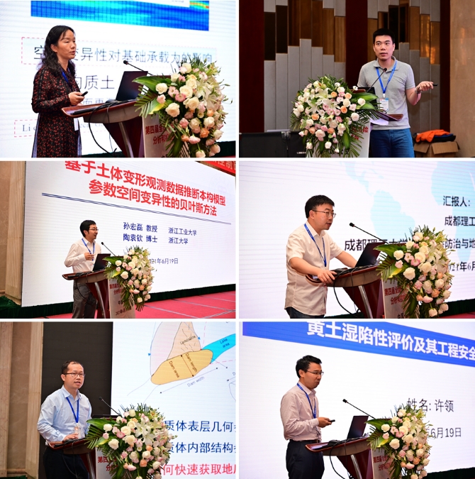 会议期间,各位专家学者以目前各自所属的专业方向及具体研究成果为主要内容,为线下线上参会人员作了精彩的学术报告。jdb电子中国官方网站(武汉)唐辉明教授以《基于演化的滑坡防控理论与方法技术》为题作会议特邀报告,美国克莱姆森大学C. Hsein Juang教授在线上作《地质/地层/岩土模型不确定性的量化及影响评价》的特邀报告,同济大学黄宏伟教授以《工程风险管控存在的问题与适应性风险管理》为题作特邀报告,武汉大学李典庆教授以《Copula理论在岩土工程不确定性与可靠性分析中应用进展》为题作特邀报告,重庆大学周小平教授以《场富集有限元法及其应用》为题作特邀报告,中国大地保险张帆总经理应邀以《IDI的实践与思考》为题作特邀报告。