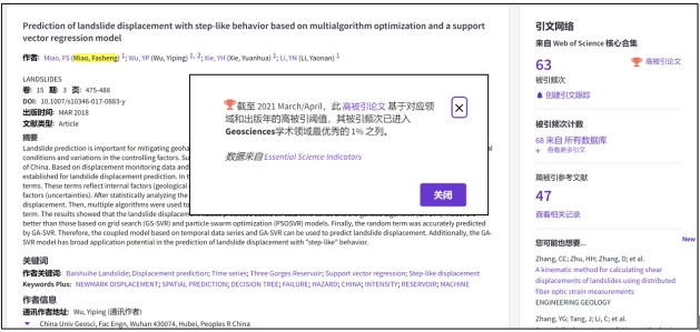 (通讯员:黄静)根据2021年7月基本科学指标数据库(Essential Science Indicators,简称ESI)最新数据显示,jdb电子官网苗发盛副教授、吴益平教授团队于2018年在国际工程地质领域顶级期刊《Landslides》上发表的学术论文“Prediction of landslide displacement with step-like behavior based on multialgorithm optimization and a support vector regression model” 入选ESI高被引论文(Highly Cited Paper)。