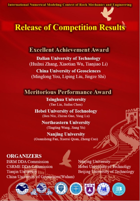 本次大赛由国际岩石力学与岩石工程学会非连续变形分析专委会(ISRM DDA)联合中国岩石力学与工程学会岩土体非连续变形分析专委会(CSRME DDA)及jdb电子中国官方网站(武汉)、天津大学、南京大学、北京工业大学、河北工业大学等多所高校联合举办,于2021年第十一届亚洲岩石力学大会(ARMS11)期间同步举行。大赛鼓励研究生对岩石力学问题的现有数值方法和软件进行公开、透明和广泛的验证,为共享岩石力学问题的实验和数值结果提供平台。