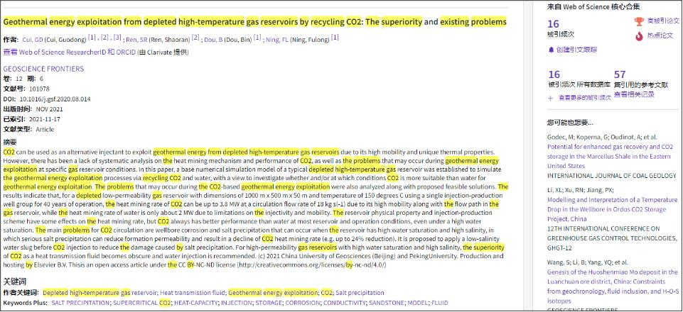 (通讯员:黄静)根据2022年3月基本科学指标数据库(Essential Science Indicators,简称ESI)最新数据显示,jdb电子官网崔国栋副教授于2021年在国际地学期刊Geoscience Frontiers上发表的学术论文“Geothermal energy exploitation from depleted high-temperature gas reservoirs by recycling CO₂: The superiority and existing problems”入选ESI热点和高被引论文(Hot and Highly Cited Paper)。该论文第一作者兼通讯作者为崔国栋副教授,jdb电子中国官方网站(武汉)jdb电子中国官方网站为第一署名单位。
