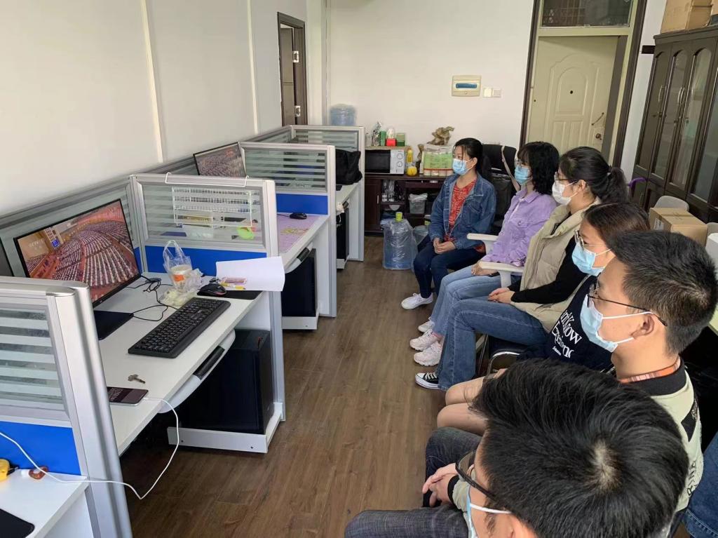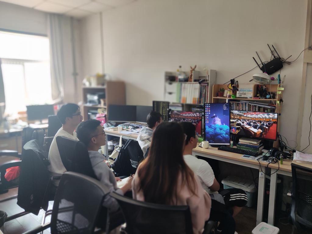 王亮清教授导学团队在工作室通过电脑进行集中收看