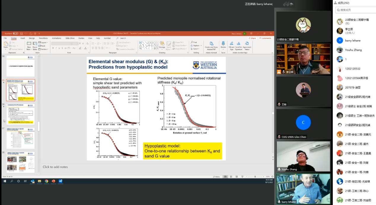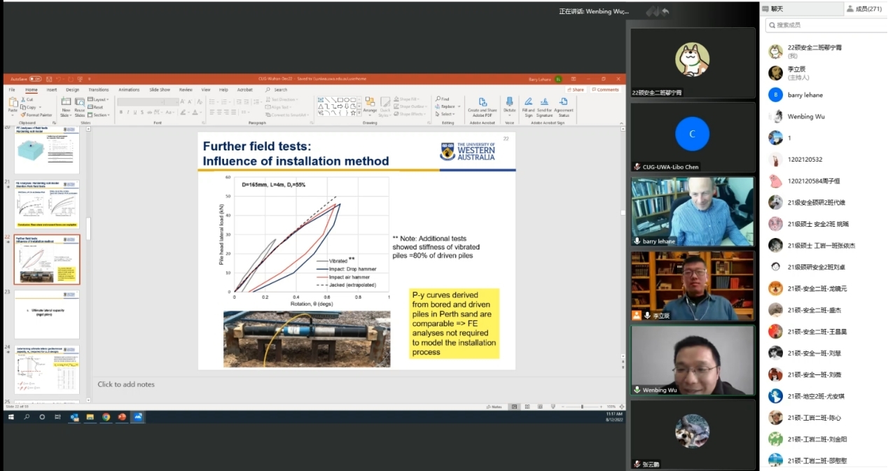 报告结束后,来自中国海洋大学的王栋教授,东南大学的张友虎教授以及jdb电子中国官方网站博士生陈力博、张云鹏等师生与Barry Lehane教授进行了精彩的讨论。最后,jdb电子中国官方网站吴文兵教授对此次学术活动进行了总结,并真诚期盼西澳大学与jdb电子中国官方网站(武汉)能进行更多的交流与合作。