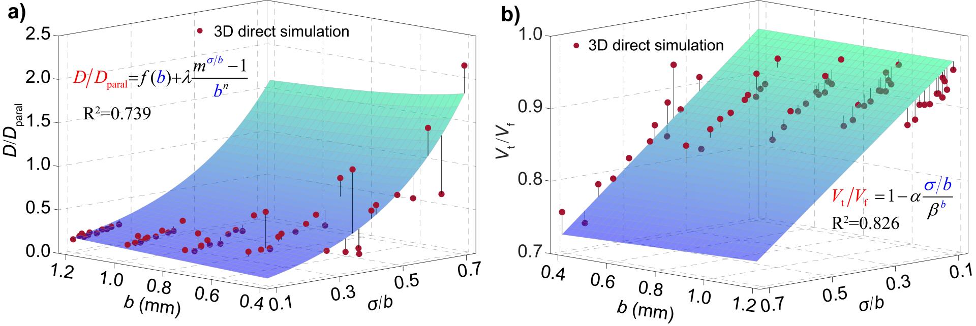 天然岩体受到复杂的应力条件、水文环境以及工程活动等因素的影响,内部普遍发育着不同尺度的宏细观裂隙。这些裂隙在地下物质运移中起着至关重要的作用,其物质传输和运移特性与许多地球物理过程和人类工程活动密切相关。然而,由于岩石裂隙的几何非均匀性和其间流体流态的复杂性,使得岩石裂隙中的物质运移特性表征和预测十分棘手。为解决上述科学问题,借助大型高性能工作站,开展了大规模三维岩石裂隙溶质运移高精度数值模拟研究,阐述并定量化了几何结构特征对溶质运移的控制机制(图1)。采用经典一维宏观对流-扩散理论,对模拟得到的溶质穿透曲线进行反演模拟分析,构建了水动力弥散系数、溶质传输速度与岩石裂隙开度、粗糙度之间的量化公式(图2)。基于经典传输解析公式和修正立方定律,嵌入传输系数参数化公式,最终推导构建了岩石裂隙溶质运移过程预测解析模型。该预测模型实现了仅依据几何结构信息,高保真度地预测溶质运移过程(图3),从而回避了大规模数值建模与模拟求解问题,模型对于直接、高效、低成本地预测裂隙岩体中的物质运移过程具有重要理论意义。