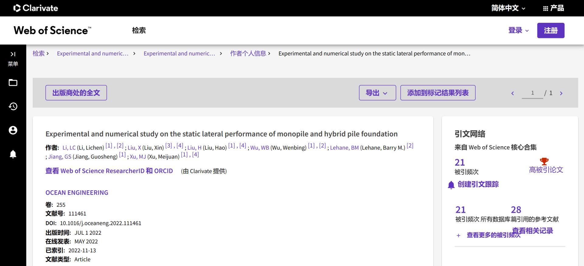 (通讯员 吴文兵)根据2023年6月基本科学指标数据库(Essential Science Indicators,简称ESI)最新数据显示,jdb电子中国官方网站勘察与基础工程系蒋国盛教授团队于2022年在国际海洋岩土领域权威期刊Ocean Engineering上发表的学术论文“Experimental and numerical study on the static lateral performance of monopile and hybrid pile foundation”入选ESI高被引论文。该论文第一作者为勘察与基础工程系博士后李立辰,通讯作者为吴文兵教授,jdb电子中国官方网站(武汉)jdb电子中国官方网站为第一署名单位。