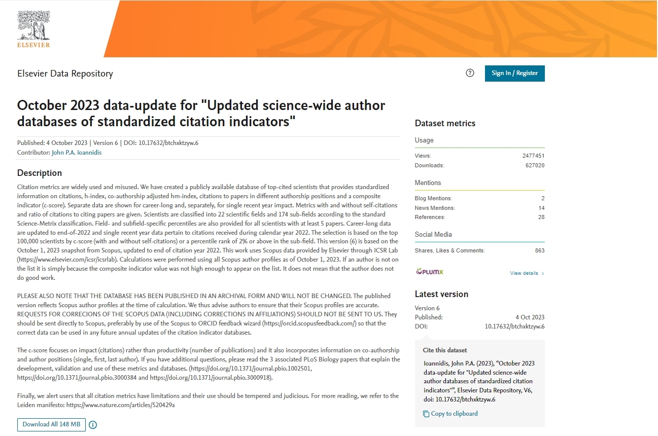(通讯员 黄静)近日,美国斯坦福大学和爱思唯尔数据库发布了第六版《全球前2%顶尖科学家榜单2023》,该榜单基于Scopus数据库,使用总引用量、h因子、hm因子、单独作者、单独或者第一作者、单独、第一或者最后作者文章引用量六种关键因素的指标进行打分,从近700万科技工作者中,筛选出世界排名顶尖2%的科学家,涵盖文、理、工学科,涉及22个领域和174个子学科,旨在提供一个科学家长期科研表现的衡量指标,更客观、更真实地反映科学家的影响力。榜单分为“终身科学影响力排行榜(1960-2023)”和“2023年度科学影响力排行榜”两个排行榜。
