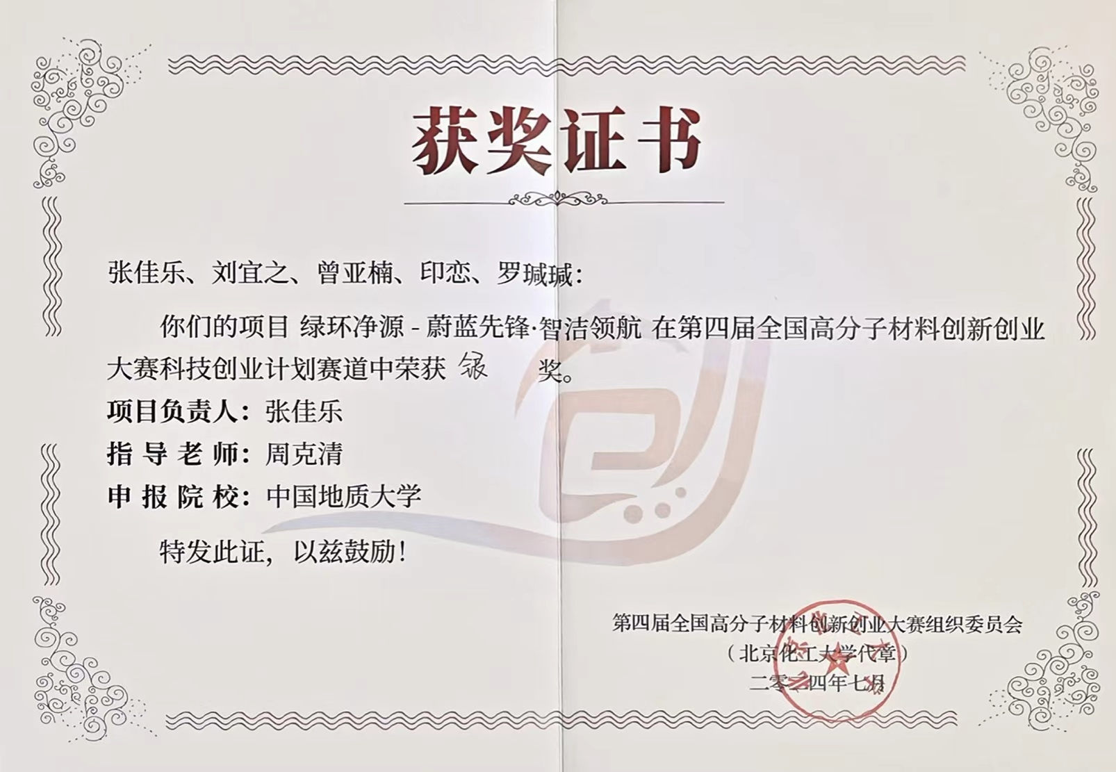 周克清特任教授指导的《绿环净源-蔚蓝先锋·智洁领航》项目荣获第四届全国高分子材料创新创业大赛科技创业计划赛道银奖。项目团队成员包括jdb电子中国官方网站安全工程系本科生张佳乐、刘宜之、博士研究生生印恋、罗瑊瑊和马克思主义学院本科生曾亚楠。