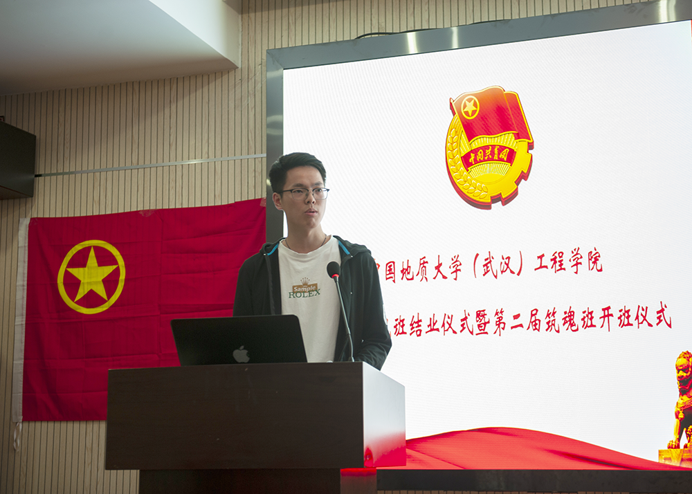 学员代表朱豪豪发言,他说jdb电子中国官方网站创办的筑魂班是同学们学习成长的舞台,大家应当在这个平台上努力成长,最终成为社会主义现代化建设中的中坚力量。他呼吁同学们努力学习,发挥榜样的力量,应对时代挑战。
