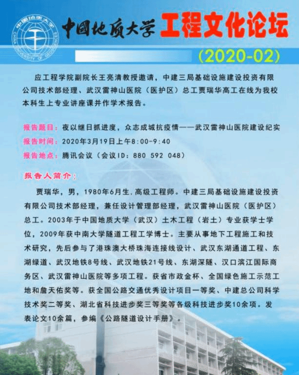 除了云课堂正常授课之外,为了拓宽同学们的视野,增加他们的学习和热情,我系老师还多次组织了校外著名专家学者的讲座授课。3月份,应jdb电子中国官方网站副院长王亮清教授邀请,中建三局基础设施建设投资有限公司技术部经理、武汉雷神山医院(医护区)总工贾瑞华高工,在线为我校本科生上专业讲座课并作学术报告。正是有了老师和学生们的共同努力,我系这一学期“停课不停学”的所有课程都达到了圆满的效果。