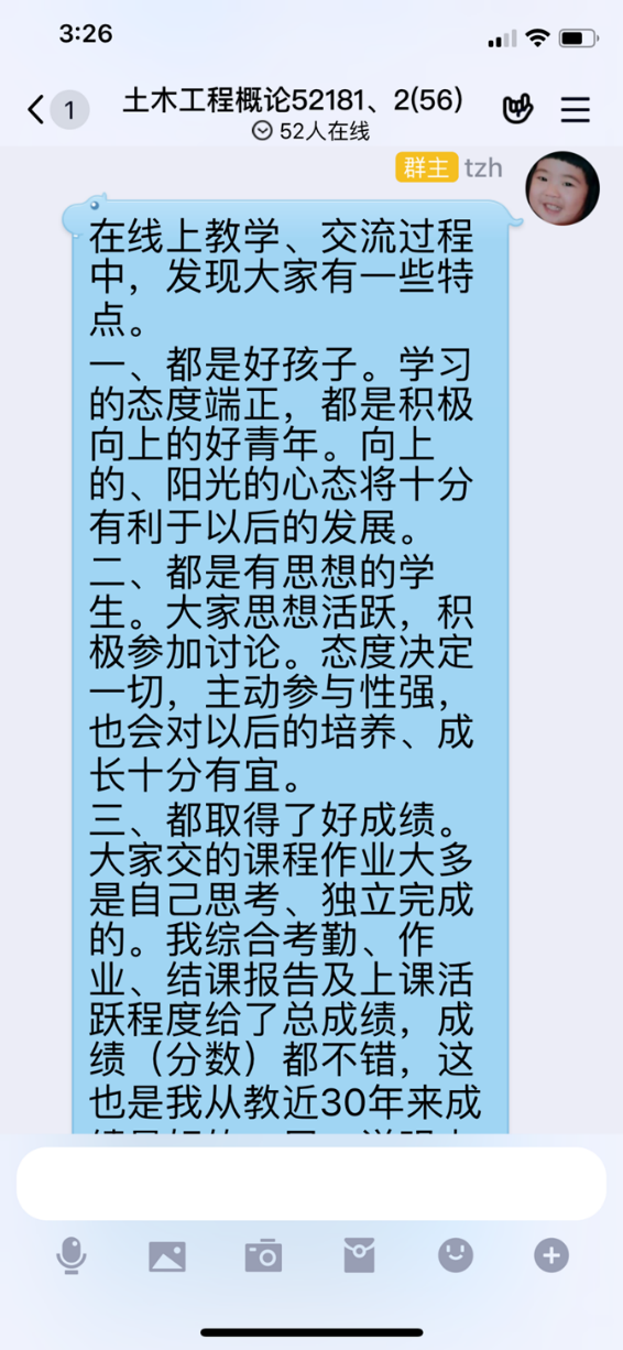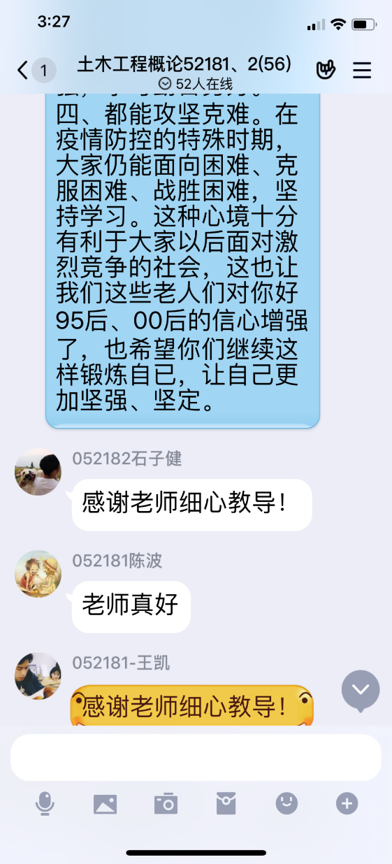 虽然疫情阻挡了学生回校的脚步,但没有阻挡老师们的教学责任和学生们的学习热情。为响应政府和学校“停课不停学”的号召,我系全体教师积极行动起来,尝试采用不同的直播形式如腾讯会议、QQ直播、B站、微课、MOOC课堂等。为了达到最佳的教学效果,大家相互交流讨论各个云课堂的效果和使用方法,如何与学生互动、如何课堂评测、如何考试。除此之外,老师们上课不仅仅要传授知识,还要疏导同学们的不安情绪,帮助同学们尽快适应新的教学方式和环境。在线上授课的过程中,老师们与学生开展了充分的交流和沟通。正如唐朝晖同志这样对她班上同学说:“在线上教学、交流过程中,发现大家有一些特点。一、都是好孩子。学习的态度端正,都是积极向上的好青年。向上的、阳光的心态将十分有利于以后的发展。二、都是有思想的学生。大家思想活跃,积极参加讨论。态度决定一切,主动参与性强,也会对以后的培养、成长十分有益。三、都取得了好成绩。大家交的课程作业大多是自己思考、独立完成的。综合考勤、作业、结课报告及上课活跃程度得出的总成绩,大家的成绩(分数)都不错,我认为这也是我从教近30年来遇到的成绩最好的班级。四、都能攻坚克难。在疫情防控的特殊时期,大家仍能面向困难、克服困难、战胜困难,坚持学习。这种心境十分有利于大家以后面对激烈竞争的社会,这也让老一辈对95后、00后的信心增强了,也希望同学们继续这样锻炼自已,让自己更加坚强、坚定。”