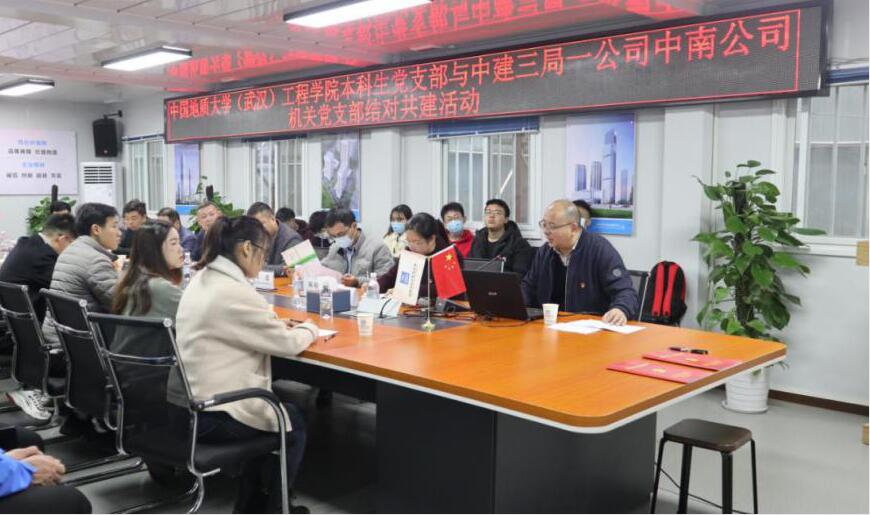 (通讯员:陈启维 李振华)为进一步探索校企合作人才培养模式,引导学生前置行业认知,中建三局一公司中南公司机关党支部与jdb电子中国官方网站(武汉)jdb电子中国官方网站道桥与建筑专业本科生党支部于2020年11月22日在光谷中心项目总部开展了“党建引领·校企共建”结对共建活动。中建三局一公司人力资源部副经理李骄健,中建三局一公司中南公司副总经理、超高层管理中心负责人梁劲松,副总经理王雅林,机关党支部书记陈婷华,jdb电子中国官方网站(武汉)jdb电子中国官方网站党委副书记江广长,学生办公室主任文新,辅导员王俊、李振华以及双方的党员代表参加本次活动。