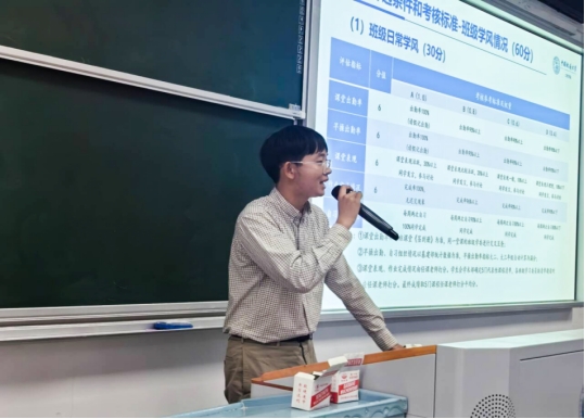 2024级辅导员彭友元介绍《jdb电子中国官方网站(武汉)jdb电子中国官方网站“优良学风示范班”创建评选办法》。他从“优良学风示范班”总体要求、创建流程、考核指标、奖惩办法等四个方面进行介绍,重点解读了班级政治理论学习、遵纪守法与文明修养、集体观念、班级制度建设、班级干部表现等5项班级综合表现指标,课堂出勤、早操出勤、课堂表现、作业完成情况、自习组织情况等5项班级日常学风指标,平均学分绩点、优秀率、及格率和英语四级通过率等4项班级课程成绩指标,以及学生参加科技创新活动等附加分项目指标。他要求同学们仔细阅读创建办法文件,对照量化评估考核指标,积极开展富有班级特色的学风建设活动。